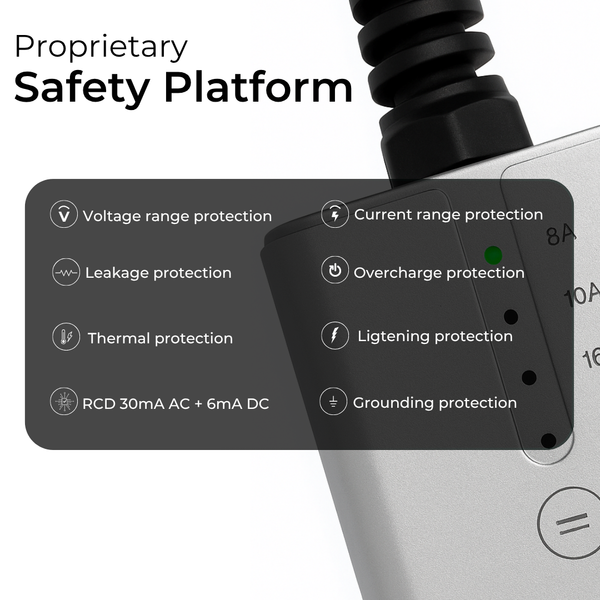 3.6kW output, Aveo ensures a fast and efficient charge for your electric vehicle, anytime and anywhere. Designed for convenience, this compact charger is lightweight and easy to carry, making it perfect for home, office, or on-the-go use. Aveo offers switchable current options of 8A, 10A, and 16A, giving you the flexibility to choose the charging speed that suits your needs. Compatible with a wide range of EVs, Aveo comes equipped with advanced safety features, ensuring a reliable and secure charging experience. Specifications & Installation Output: 3.6kW Current Options: Switchable between 8A, 10A, and 16A Input Voltage: 220-240V Cable Length: 5 meters Connector Type: Type 2 (IEC 62196) Dimensions: 250mm x 120mm x 80mm Weight: 2.5 kg Operating Temperature: -30°C to +50°C Safety Features: Overheat prevention, Short circuit protection grounding, water resistance, dust resistance Installation Requirements Power Socket: A dedicated 16A power socket with adequate connected load is required for optimal performance. Wiring: Use a minimum of 4 square mm cable to handle the electrical load safely. Earthing: Ensure the power socket is properly earthed to prevent electrical hazards. Circuit Breaker: Install a Residual Current Breaker (RCB) and a Surge Protection Device (SPD) to protect against power surges and electrical faults.